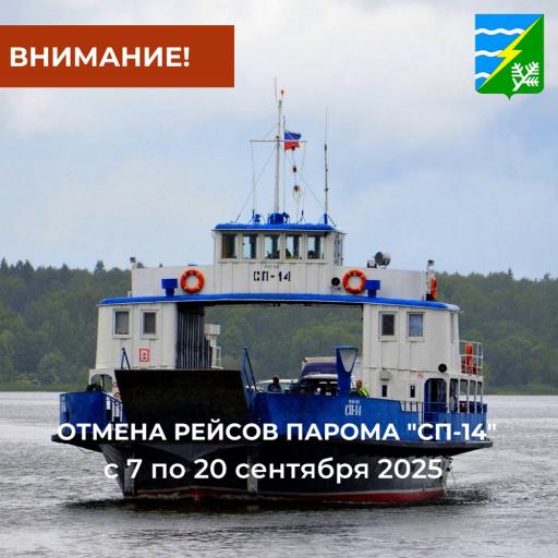 Внимание! Отмена рейсов парома СП-14 по маршруту Зеленый Бор - Топорок с 07 сентября по 20 сентября 2025 г.