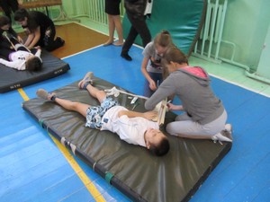 Хочется отметить, что больше всех (50 раз) отжался от пола ученик 8 «А» класса Артем Жилов, а Алина Прокопьева (8 «А» класс) за 30 секунд максимально (27 раз) сделала упражнение на пресс. Весело прошли соревнования по оказанию первой медицинской помощи. Девочки «медсестры» одной команды накладывали шины на якобы поломанную руку «потерпевшего». Но этим не закончилось – нужно было перенести больного на носилках в пункт назначения - этим, конечно, занялась сильная половина человечества. Мальчишки дружно и весело переносили «пострадавших», одного из которых умудрились потерять, вызвав при этом смех не только у болельщиков, но и у строгого жюри. Вопросы в тесте по ОБЖ были довольно сложные: В каких ситуациях происходит большинство ожогов? Каким огнетушителем нужно тушить загоревшуюся электропроводку или электроприборы? и т.д. Но ребята, даже за ограниченное время показали неплохие результаты.